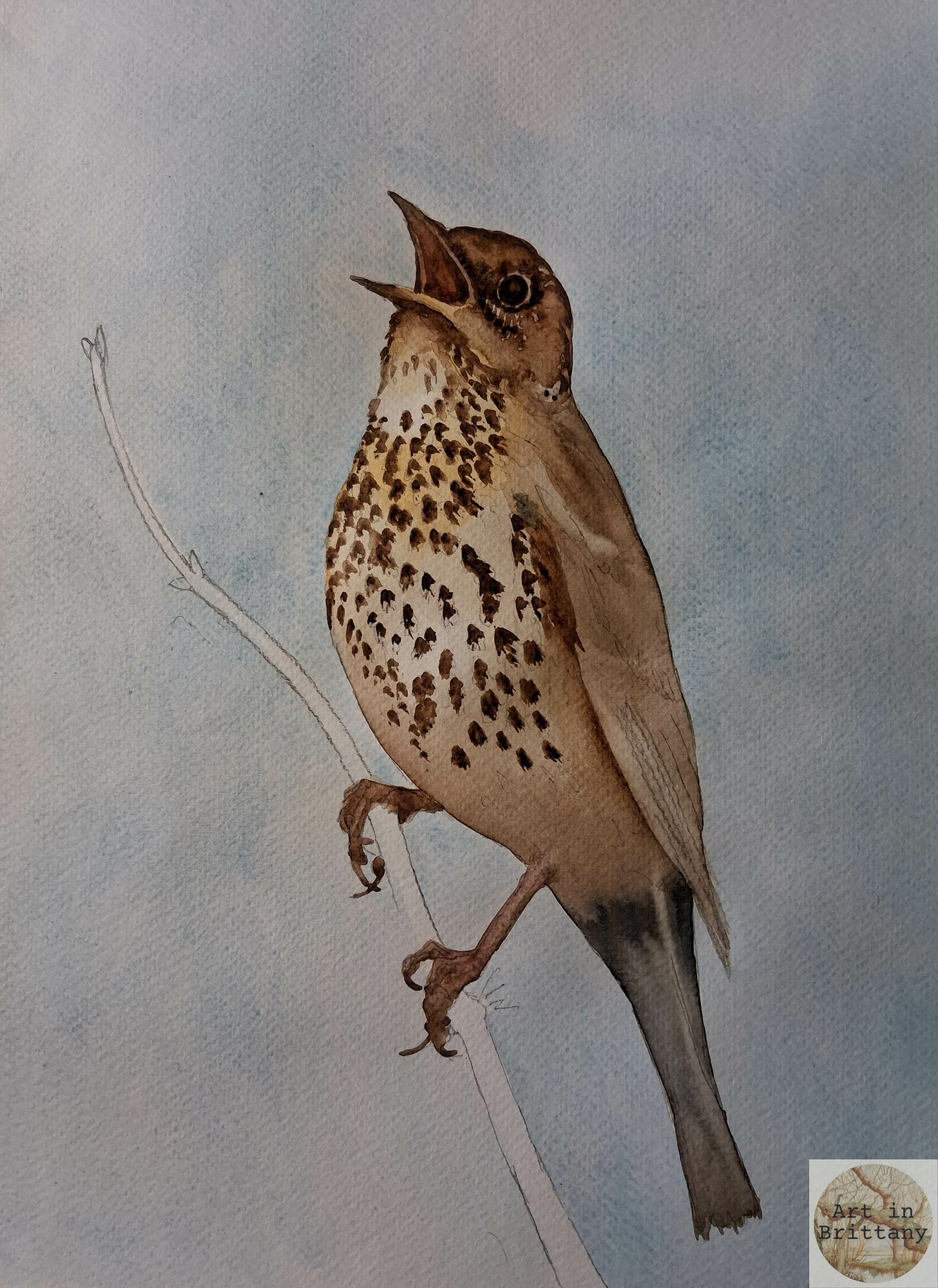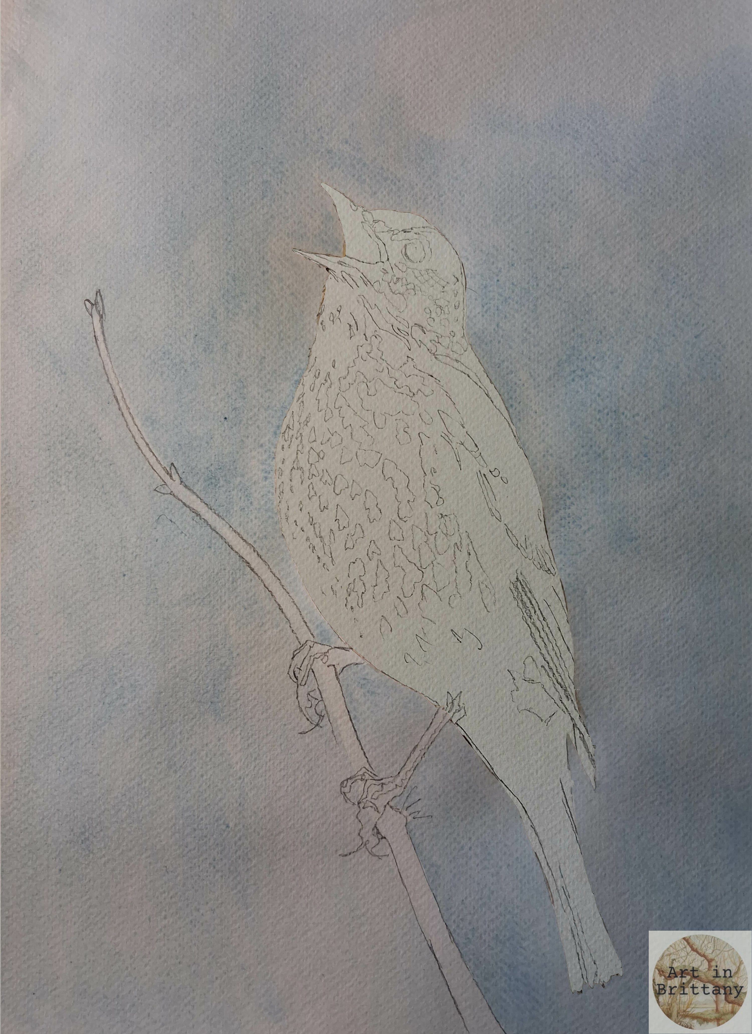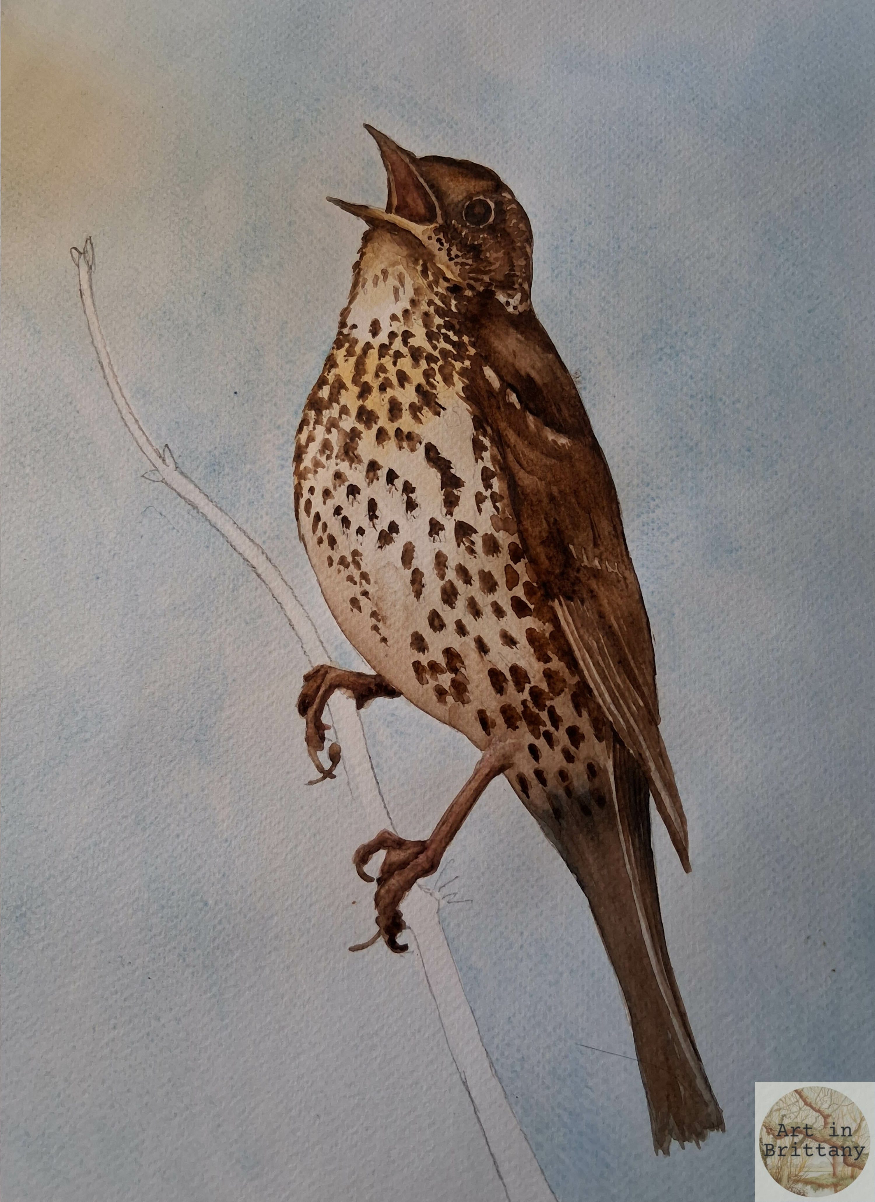 Every morning, a thrush sings from the treetops above my stables, greeting the day long before the sun fully rises. There’s something wonderfully sure and hopeful in his voice, and I wanted to capture that feeling in paint. This tutorial walks you through the watercolour inspired by his dawn chorus.